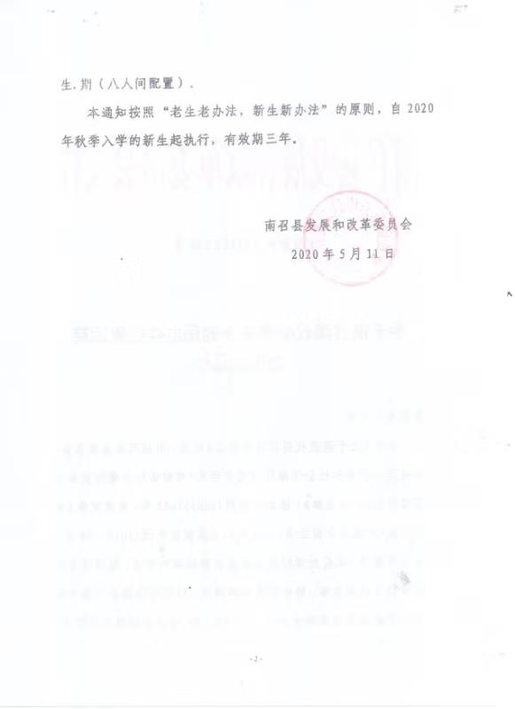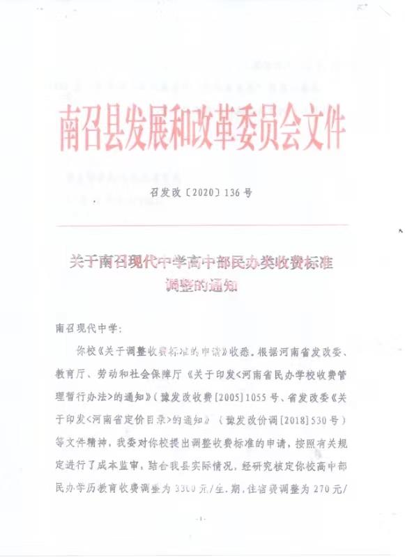 关于调整南召现代中学民办生收费标准的通知